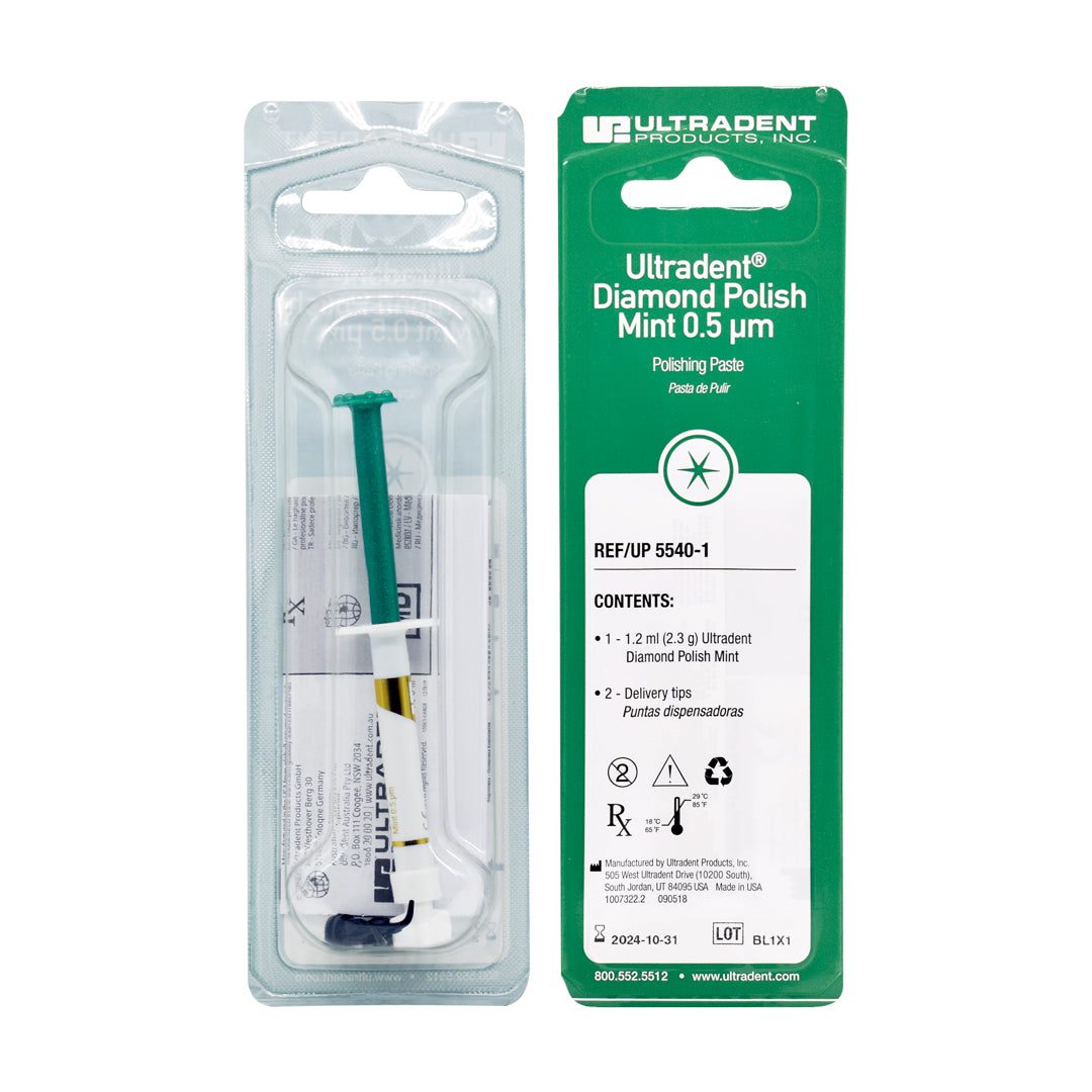 Ultradent Diamond Polish Mint 0.5/1 μm es una pasta de pulido diamantada ultrafina con partículas de diamante microcristalino blanco de alta calidad, formulada en gel soluble en agua para un acabado estético superior sin salpicaduras.