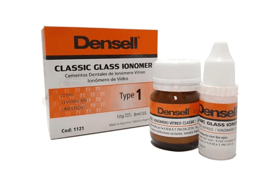 Ionómero vitreo clásico para cementación Tipo 1 USO: Este material es para cementación de coronas, puentes, inlay, onlay, carillas y distintos tipos de prótesis fija. Esta compuesto en su polvo por partículas de vidrio cerámico que al mezclarse con el líquido forman un material que por acción de la liberación de iones genera una adhesión con los sustratos de esmalte y dentina por un lado y la prótesis por otro.